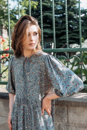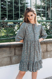 Платье свободного кроя с подрезом чуть выше линии талии и воланом по низу изделия. Рукав чуть ниже локтя, широкий присборен в низу на резинку, с мягкой сборкой у проймы. Застежка горловины по центру переда на завязочку-бант. Длина изделия р.42-44 - 94 см, р.46-50 - 95 см, р.52-56 - 96 см Длина рукава р.42-44 - 47 см, р.46-50 - 47 см, р.52-56 - 47 см