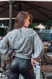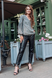 Брюки из плотной стрэйчевой кожи с изнанкой из замши. Пояс на резинке, застежка-молния имитация, карманы в боковых швах-хулиганы. По переду и спинке горизонтальные и вертикальные подрезы с отделочными строчками. Длина р.42-44 - 92см, р.46-50 - 93см, р.52-56 - 94см
