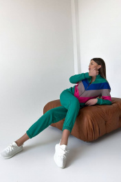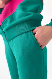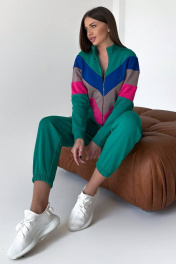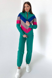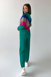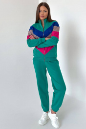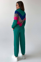 Женский трендовый костюм в стиле athleasure пошит из комфортной, всесезонной ткани. Костюм состоит из джемпера на молнии и джоггеров. Джемпер с дизайнерскими, наклонными резами и на переде, и на спинке, выполненных из разных контрастных оттенков. Рукава визу имеют манжеты. Воротник-стойка, манжеты, низ джемпера выполнены из ткани-компаньена кошкорсе. На левом переде вышит логотип в цвет полоски. Брюки имеют современный крой и облегание, удобные карманы на передних половинка, притачной пояс и резинку внутри. Низ брюк присобран на резинку. Длина свитшота по спинке: 65-67 см для роста 164-170 см, 67-69 см для роста 170-176 см. Длина рукава от горловины: 71-73 см для роста 164-170 см, 73-75 см для роста 170-176 см. Полуобхват груди: 42 р. - 51 см, 44 р. - 53 см, 46 р. - 55 см, 48 р. - 57 см, 50 р. – 59 см, 52 р. – 61 см. Длина брюк по боковому шву с поясом: 100-102 см для роста 164-170 см, 102-104 см для роста 170-176 см. Полуобхват бедер: 42 р. - 49 см, 44 р. - 51 см, 46 р. - 53 см, 48 р. - 55 см, 50 р. – 57 см, 52 р. – 59 см.
