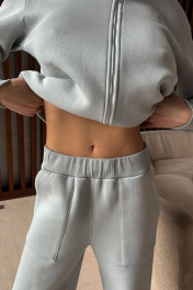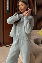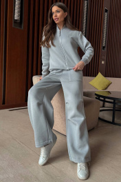 Современный комфортный костюм, состоит из брюк карго и укороченного бомбера. Отлично подойдёт для дома, прогулок, путешествий и отдыха. Пошит из теплой, комфортной ткани. Бомбер прямого силуэта, с застежкой молнией из металла. Горловина, манжеты рукавов выполнены из ткани-компаньона кошкорсе. На левом переде вышивка-логотип в цвет ткани. Бомбер с кулисой по низу с резинкой внутри и фиксаторами на боковых швах. Брюки расширенные к низу, с возможностью заузить и зафиксировать ширину внизу (низ имеет кулиску с резинкой и фиксатором). На передних половинках брюк удобные накладные карманы, складки в районе линии колен. Пояс из ткани компаньена кошкорсе со шнуром и резинкой внутри. Длина бомбера по спинке 57-60 см. Длина рукава от горловины: 72-74 см для роста 164-170 см, 74-76 см для роста 170-176 см. Полуобхват груди бомбера: 42 р - 54 см, 44 р - 56 см, 46 р. - 58 см, 48 р. - 60 см, 50 р. - 62 см. Длина брюк 102-104 см для 164-170 см, 105-107 см для 170-176 см. Полуобхват бедер в брюках: 42 р - 48 см, 44 р - 50 см, 46 р - 52 см, 48 р - 54 см, 50 р - 56 см.
