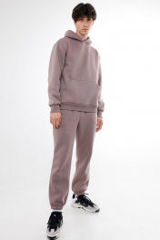 Костюм комфортный покроя oversize, спортивного стиля из комфортной ткани (футера с начесом). Костюм состоит из худи и брюк. Худи прямого силуэта, с притачной манжетой по низу изделия. Худи имеет двойной капюшон с кулисой и шнуром внутри. На переде карман - кенгуру и вышивка – логотип по центру переда в цвет ткани. Рукава втачные с манжетой. Брюки с притачным поясом с резинкой и шнурком внутри. Передняя половинка брюк с боковыми карманами. Низ брюк присобран на резинку. Длина худи по спинке 69-75 см в зависимости от размера и роста. Длина рукава: 64-67 см для роста 176-182, 68-71 см для роста 182-188. Полуобхват груди худи: 46 р. - 56 см, 48 р. - 58 см, 50 р. - 60 см, 52 р. - 62 см, 54 р. - 41 см, 56 р. - 66 см, 58 р. - 68 см, 60 р. - 70 см, 62 р. - 72 см. Длина брюк по боковому шву с поясом: 103-105 см для роста 176-182, 107-109 см для роста 182-188. Полуобхват бедер: 46 р. - 50 см, 48 р. - 52 см, 50 р. - 54 см, 52 р. - 56 см, 54 р. - 58 см, 56 р. - 60 см, 58 р. - 62 см, 60 р. - 64 см, 62 р. - 66 см.