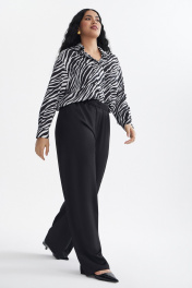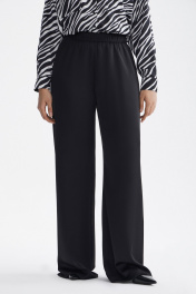 Брюки прямого силуэта, с цельнокроенным поясом, без застежки, верх брюк присборен на резинку. Брюки без боковых швов.