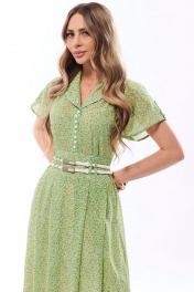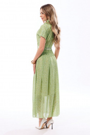 Платье c отложным воротником и лацканами, втачным широким поясом, застежкой на потайную молнию в левом боковом шве. Верхняя часть платья с кокеткой переда и спинки. Верхняя часть переда с имитацией застежки, односторонними складками по шву притачивания кокетки и пояса, верхняя часть спинки с односторонними складками по шву притачивания пояса. На втачном поясе расположены шлевки для двух съемных поясов. Нижняя часть переда и спинки с четырьмя односторонними складками по шву притачивания пояса. Платье без рукавов , со спущенным плечом. На кокетке платья расположена декоративная пата, закрепленная по плечу тремя пуговицами. Платье со съемными поясами. Платье на подкладке по нижней части.
