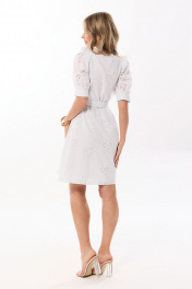 Платье с центральной застежкой на навесные петли и пуговицы, без воротника, с круглым вырезом горловины. По переду отрезная кокетка, с воланом. По боковым швам расположены шлевки для съемного пояса. Рукав короткий, , с отрезной манжетой. Окат рукава и шов притачивания манжеты присборен. Платье со съемным поясом. Платье на подкладке.