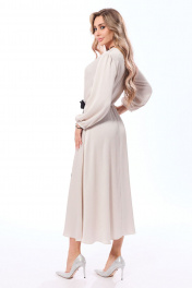 Платье, без воротника, без застежки, отрезное по линии талии. Лиф переда с запахом. Талия собрана на резинку. Верхняя часть спинки с талиевыми вытачками. Нижняя часть платья расширена к низу. Рукав втачной, 3/4, с манжетой, присборенной на резинку. Платье со съемным декоративны поясом из основной ткани и декоративным цветком на поясе. платье без подкладки