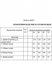 Платье без воротника, с круглым вырезом горловины, центральной застежкой на петли и пуговицы по лифу переда. Платье отрезное по линии талии. По лифу переда с нагрудными вытачками. Спинка со средним швом, заканчивающимся разрезом, талиевыми вытачками. Рукав втачной, короткий, по низу, присборен на резинку. Окат рукава присборен. Цветовая гамма для верха, подкладки, фурнитуры, отделки: платье из ткани в одной цветовой гамме. платье на подкладке