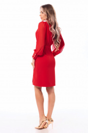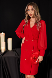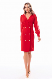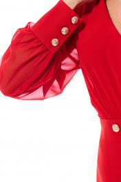 Платье без воротника, с V-образным вырезом горловины, центральной двубортной застежкой на петли и пуговицы по нижней части переда. Платье отрезное по линии талии. По лифу переда полочки с запахом, на уровне груди фиксируются пришивной кнопкой По шву притачивания к нижней части переда лиф переда и спинки присборен. Нижняя часть спинки с талиевыми вытачками. Рукав втачной, длинный, с отрезной манжетой, по шву притачивания манжеты присборен на резинку. Окат рукава присборен. Цветовая гамма для верха, подкладки, фурнитуры, отделки: платье из ткани в одной цветовой гамме. Лиф переда и спинки и рукав- из шифона в тон основной ткани. платье на подкладке