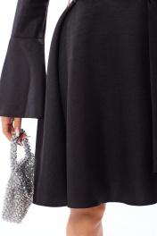 Платье без воротника, с круглым вырезом горловины, застежкой на потайную молнию в среднем шве спинки. Платье отрезное по линии талии. Лиф переда с талиевыми и нагрудными вытачками. Нижняя часть платья расклешенная. Спинка со средним швом, талиевыми вытачками. Рукав втачной, длинный, с отрезной манжетой. Окат рукава со сборкой. Манжеты расширенные к низу. Платье со съемным поясом. На талии расположены шлевки для съемного пояса. Силуэт: полуприлегающий