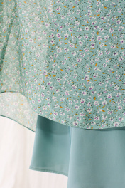 Платье без воротника, с V-образным вырезом горловины. Платье отрезное по линии талии. Верхняя часть переда со средним швом, нагрудными вытачками. Верхняя часть спинки с цельная. Нижняя часть платья расклешенная. Шов по талии присборен резинкой. Рукав втачной, 3/4, с отрезной манжетой. По шву притачивания манжет- сборка. Окат рукава присборен. Манжета присборена резинкой. Платье на подкладке.