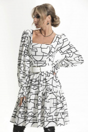 Платье, с застежкой на потайную молнию по среднему шву спинки, без воротника, с фигурным вырезом горловины. Платье отрезное по линии талии. Нижняя часть платья состоит из двух воланов. Лиф переда с рельефами, выходящими из горловины. Лиф спинки со средним швом, рельефами, выходящими из горловины. Рукав втачной, длинный, с отрезной манжетой. Окат и шов притачивания манжеты присборен. Платье со съемным поясом.