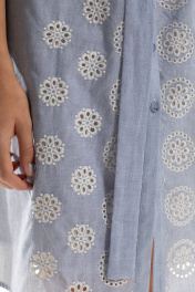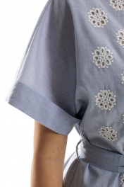 Платье с центральной застежкой на петли и пуговицы, втачным воротником- стойкой. Спинка со съемным швом. Рукав короткий, цельнокроенный с отложной манжетой. Платье со съемным поясом. Силуэт: прямой Вид покроя рукава: цельнокроенный, с отложной манжетой Цветовая гамма для верха, подкладки, фурнитуры, отделки: платье выполнено из ткани с купонной вышивкой в одной цветовой гамме. Комплектация: полочки платья на подкладке