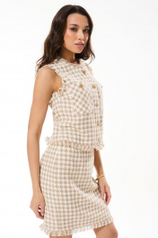 Юбка без пояса , застежкой на потайную молнию в среднем шве заднего полотнища. Переднее полотнище с талиевыми вытачками. Заднее полотнище со средним швом, заканчивающимся разрезом. По низу юбки- бахрома из основной ткани. Юбка на подкладке.