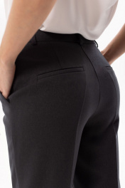 Жакет с центральной застежкой на петлю и пуговицу, с отрезной стойкой. Перед с вытачками от прорезного кармана с листочкой и рельефами от проймы. Бочок спинки жакета переходит на перед. На переде жакета отрезные детали вдоль линии подборта. Спинка со средним швом, вытачками и рельефами выходящим из проймы. Жакет на подкладке. Брюки с отрезным поясом на один брючный крючок и потайную пуговицу, застежку-гульфик. Передние половинки с карманами, наклонными к боковому шву и бочком-подзором. Задние половинки с вытачками и прорезными карманами с листочкой. Брюки со стрелками и настрочными шлевками.