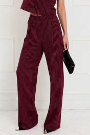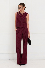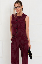 Жилет с центральной застежкой на петли и пуговицы, без воротника, с круглым вырезом горловины. По переду с рельефами, выходящими из проймы, прорезными карманами- имитацией с листочками. Спинка со средним швом, рельефами, выходящими из проймы. Брюки с отрезным поясом, на поясе расположены шлевки. Пояс в области спинки присборен на резинку. В боковых швах расположены карманы. Застежка гульфик. Цветовая гамма для верха, подкладки, фурнитуры, отделки: комплект выполнен из ткани в одной цветовой гамме. Тип ткани: текстильный, костюмно – плательный Комплектация: жилет на подкладке, брюки