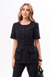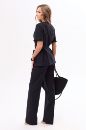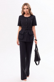 Жакет с центральной застежкой на петли и пуговицы с без воротника, с круглым вырезом горловины. По переду с рельефами, выходящими из проймы до низа и накладными карманами с клапанами, расположенными на уровне линии бедер. Спинка со средним швом, рельефами, выходящими из проймы. Жакет со съемным поясом. Рукав втачной, короткий. По низу рукава, низу клапанов, краю накладных карманов притачивается бахрома из основной ткани. Брюки без пояса, верхний срез обработан обтачками. Застежка на потайную молнию в левом боковом шве. В области спинки талия присборена с помощью резинки. Силуэт: полуприлегающий Вид покроя рукава: втачной, короткий Цветовая гамма для верха, подкладки, фурнитуры, отделки: комплект выполнен из ткани в одной цветовой гамме. Тип ткани: текстильный, костюмно – плательный комплект: лен 100%