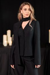 Жакет с центральной потайной застежкой на петли и пуговицы, без воротника, с V-образным вырезом горловины. По переду с рельефами, выходящими из проймы и входящими в боковой шов. По спинке с рельефами, выходящими из проймы. По н6изу спинки- баска. Рукав втачной, длинный. Брюки-с отрезым поясом, на поясе расположены шлевки. В области спинки пояс присборен на резинку. Застежка гульфик. Передние половинки с карманами. Вход в карман наклонный к боковому шву. комплект на подкладке
