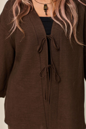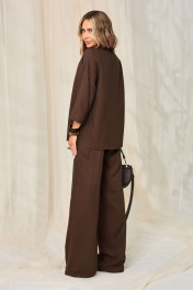 Блузка с центральной застежкой на завязки, без воротника, с V-образным вырезом горловины. По полочкам с отрезными планками, на которых закреплены завязки. Спинка цельная. Плечо спущенное. Рукав втачной, 3/4. Брюки с отрезным поясом. Пояс присборен на резинку. На передних половинках расположены карманы, вход в карман наклонный к боковому шву. Силуэт: прямой Вид покроя рукава: втачной, 3/4 Цветовая гамма для верха, подкладки, фурнитуры, отделки: комплект выполнен из ткани в одной цветовой гамме.