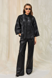 Куртка с центральной застежкой на молнию, втачным воротником - стойкой. Полочки с горизонтальным швом, нижняя часть полочек со сборкой. По нижней части полочек прорезные карманы с листочками. Спинка с отрезной кокеткой, шов притачивания кокетки присборен, низ спинки присборен. Рукав 3/4, цельнокроенный. Линия низа- фигурная. По низу боковых швов- кулиса со шнуром. Силуэт: прямой. Вид покроя рукава: цельнокроенный Цветовая гамма для верха, подкладки, фурнитуры, отделки: куртка выполнена из ткани-кожзам Тип ткани: текстильный