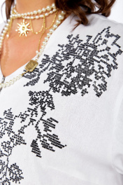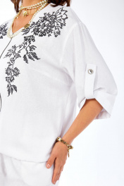 Летний женский костюм из льна — идеальный выбор для тёплых дней, когда хочется выглядеть стильно и чувствовать себя комфортно. Натуральная льняная ткань отлично пропускает воздух, приятно ощущается на коже и помогает легче переносить жару, оставаясь аккуратной и опрятной в течение дня. Костюм смотрится легко и современно: лаконичный крой подчёркивает силуэт, но не сковывает движения, а натуральная фактура льна придаёт образу благородную «дорогую простоту». Такой комплект одинаково хорошо подходит и для города, и для отпуска: в нём удобно гулять, работать, встречаться с друзьями или отправляться на вечерние летние мероприятия.Костюм женский 2-х предметный, состоящий из жакета и брюк. Жакет: прямого силуэта, со спущенным плечом, по переду идет застежка «молния». Перед с нагрудными вытачками, идущими от центра груди к боковым швам. По переду симметрично расположена дизайнерская вышивка. Спинка без среднего шва, с отрезной кокеткой и широкой складкой на кокетке. По центру спинки расположена дизайнерская вышивка. Рукава длиной ¾ , с патами на пуговицы. Низ изделия на резинке Брюки: широкие, прямые, на поясе с резинкой. В боковых швах брюк имеются наклонные карманы.