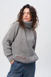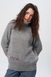 Уютный и стильный женский свитер - идеальный выбор для холодных осенних и зимних дней. Свитер выполнен из мягкой шерстяной пряжи крупной вязки с содержанием акрила, что помогает ему держать объемную форму. Модель с высоким воротником подчеркивает вашу шею и добавляет шарма внешности. Свитер размера one size свободного силуэта, поэтому подойдет практически любой фигуре. Низ свитера и рукава завершаются манжетами плотной вязки, что подчеркивает элегантность и стиль, и благодаря этому свитер удобно носить как расправленным, так и фиксировать на талии. Плотная вязка не растягивается и сохраняет форму даже после долгой носки. По переду свитер украшен индивидуальной вышивкой на воротнике — сердце и по низу свитера — надпись «AMOUR». Этот мягкий вязаный джемпер с объемным горлом не только теплый, но и модный аксессуар для вашего гардероба. Базовая шерстяная кофта подчеркнет ваш неповторимый стиль и добавит комфорта. Почувствуйте мягкость и тепло этого свитера — и вы точно не захотите его снимать! Длина по спинке от горловины 65 (+-1 см), длина рукава от горловины 71 (+-1 см). Обхват груди 128 см, обхват бедер 110 см. Рост модели на фото 178 см, размер 44 (S). Данная модель подойдет на размеры 44-52. Подойдет на размеры 44-52.