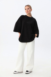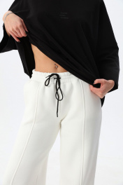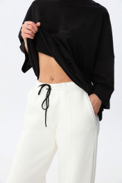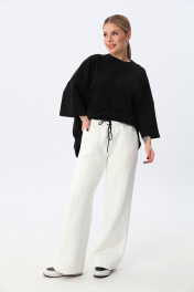 Брюки палаццо прямого кроя обладают стильной шириной по низу (30–31 см ½) и рельефным швом по центру переда. Низ брюк можно регулировать с помощью резинки-жгута и фиксаторов, что позволяет адаптировать посадку и силуэт. Удобные угловые карманы, обработанные в боковых швах, завершают образ и делают модель практичной для повседневной носки.