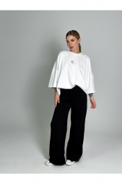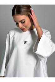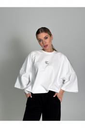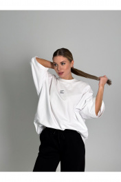 Современная футболка силуэта oversize с мягкой архитектурой формы и выразительным акцентом. Выполнена из плотного трикотажа (95% хлопок, 5% эластан), который обеспечивает комфорт, эластичность и аккуратную посадку. Спущенная линия плеча (≈19 см) и удлинённый рукав формируют актуальный расслабленный силуэт. Круглый вырез горловины аккуратно обработан, низ изделия и рукавов — эластичным швом для чистого и премиального вида. Длина — чуть ниже линии бёдер. one size 44-50. one size plus 52-58.