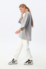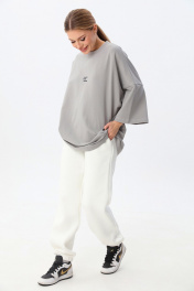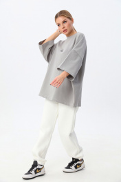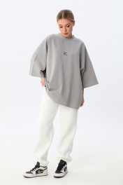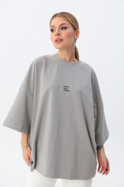 Современная футболка силуэта oversize с мягкой архитектурой формы и выразительным акцентом. Выполнена из плотного трикотажа (95% хлопок, 5% эластан), который обеспечивает комфорт, эластичность и аккуратную посадку. Спущенная линия плеча (≈19 см) и удлинённый рукав формируют актуальный расслабленный силуэт. Круглый вырез горловины аккуратно обработан, низ изделия и рукавов — эластичным швом для чистого и премиального вида. Длина — чуть ниже линии бёдер. one size 44-50. one size plus 52-58.