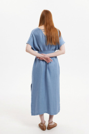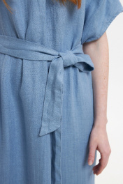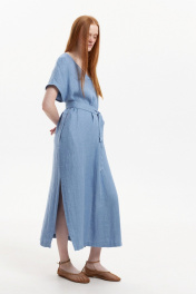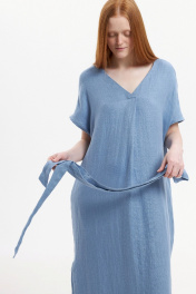 Платье прямого силуэта с цельнокроенным коротким рукавом. Вырез горловины У-образный. Перед со средним швом и односторонней складкой от линии горловины. Карманы в боковых швах. Боковые швы заканчиваются разрезами. Высота разреза 44 см. По спинке У-образный вырез, соединяющийся двумя тонкими перемычками. В комплекте с платьем идёт съёмный пояс. Длина рукава с плечевым швом 34 см. Длина изделия по спинке 129 см. Изделие выполнено из 100% льна переплетения в ёлочку с эффектом умягчения. Стирка при 30°.
