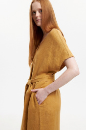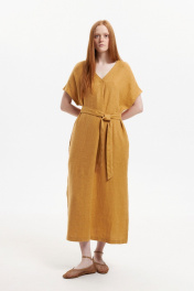 Платье прямого силуэта с цельнокроенным коротким рукавом. Вырез горловины У-образный. Перед со средним швом и односторонней складкой от линии горловины. Карманы в боковых швах. Боковые швы заканчиваются разрезами. Высота разреза 44 см. По спинке У-образный вырез, соединяющийся двумя тонкими перемычками. В комплекте с платьем идёт съёмный пояс. Длина рукава с плечевым швом 34 см. Длина изделия по спинке 129 см. Изделие выполнено из 100% льна переплетения в ёлочку с эффектом умягчения. Стирка при 30°.