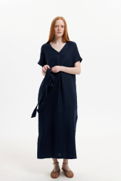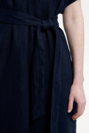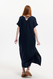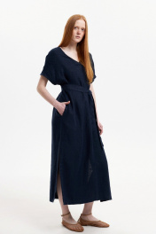 Платье прямого силуэта с цельнокроенным коротким рукавом. Вырез горловины У-образный. Перед со средним швом и односторонней складкой от линии горловины. Карманы в боковых швах. Боковые швы заканчиваются разрезами. Высота разреза 44 см. По спинке У-образный вырез, соединяющийся двумя тонкими перемычками. В комплекте с платьем идёт съёмный пояс. Длина рукава с плечевым швом 34 см. Длина изделия по спинке 129 см. Изделие выполнено из 100% льна переплетения в ёлочку с эффектом умягчения. Стирка при 30°.