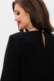 Платье свободного А-образного силуэта, выполнено из мягкого трикотажа. Горловина округлая не глубокая, рукав втачной 7/8-х и по низу рукава отделка из ткани в виде перьев. Застежка в изделии на петлю-пуговицу в шве по спинке. Декором является отделка по низу из ткани в виде перьев. Длина рукава - 44см, ширина плеча – 8см, длина изделия – 96см.