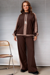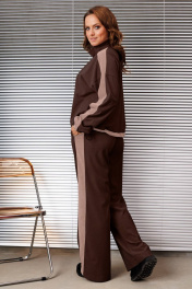 Костюм женский состоящий из джемпера и брюк. Джемпер свободного силуэта, вырез горловины со стойкой и застежкой на тесьму-молнию. Рукав спущенный, длинный. Декором являются лампасы из отделочной ткани. По лицу изделия кулиса из резинки. Брюки палаццо, по талии на резинке, в боковых швах карманы и лампасы из отделочной ткани. Брюки без застежки. Р-р 50: Длина джемпера по спинке – 59см Длина брюк – 109см с учетом ширины пояса.