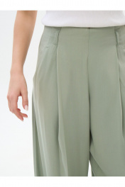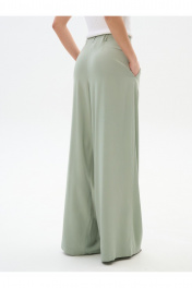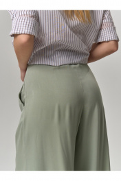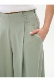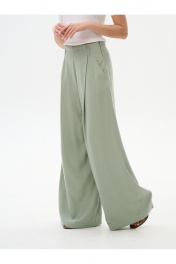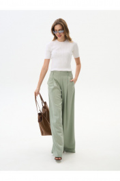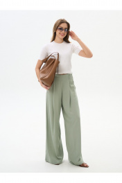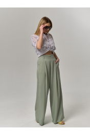 1. Брюки женские широкие палаццо с высокой талией. 2. Застежка в боковом шве на потайную молнию. 3. На передних частях по линии талии выполнены модельные складки. 4. На спинке брюк обработаныконструктивные вытачки. 5. Длина шагового шва-87 см. 6. Бережная стирка при 30 градусах.