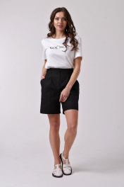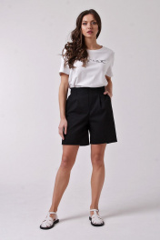 1. Шорты женские, удлиненные. Бермуды 2. Без застежки, выполнена имитация, пояс обработан резинкой. 3. На спинке обработаны накладные карманы 4. На переде-боковые карманы с отрезным бочком 5. Длина шагового (внутреннего шва)-18 см. 6. Бережная стирка при 30 градусах