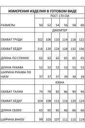 Женский костюм полуприлегающего силуэта, состоящий из джемпера и юбки, выполнен из мягкого трикотажного полотна средней плотности с содержантем вискозы 70%. Джемпер по переду и рукавам декорирован пробивными бусинами, вырез горловины округлой формы с небольшой цельнокроенной стойкой; по спинке застежка-молния. Класичесская юбка-карандаш на трикотажной подкладке с завышенной линией талии на обтачке застегивается на молнию, сзади шлица. Костюм полностью соотвествует заявленному размеру. Пожалуйста,пользуйтесь таблицей замеров готового изделия . Уход за трикотажными изделиями: - при стирке в стиральной машине выбрать бережный либо деликатный режим , температура воды не выше 40 градусов .