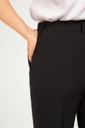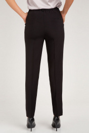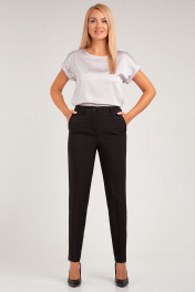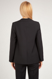 Брючный костюм-двойка. Пиджак полуприталенного силуэта, с однобортной застежкой на пуговицу. Отложной воротник с лацканами. Спереди боковые горизонтальные карманы в рамку. Средний шов спинки заканчивается шлицей. Жакет на подкладке. Классические брюки со стрелками, заужены к низу. Притачной пояс со шлевками, по спинке сосборен на резинку. Спереди косые боковые карманы. По спинке имитация горизонтальных карманов с листочкой.
