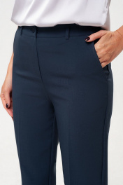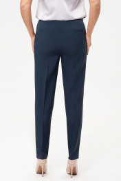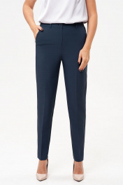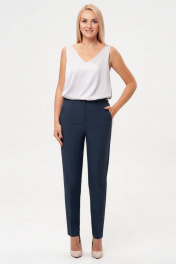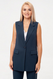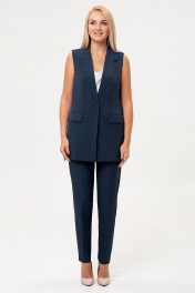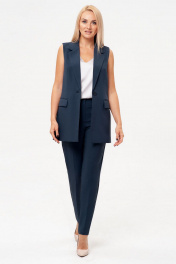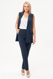 Брючный костюм-двойка, выполнен из костюмного полотна. Удлиненный жилет полуприлегающего силуэта с однобортной застежкой на пуговицу. Отложной воротник с лацканами. Жилет с боковыми рельефами, спинка со средним швом. Спереди горизонтальные боковые карманы в рамку, с клапанами. Жилет на подкладке. Классические брюки со стрелками, заужены к низу. Притачной пояс со шлевками, по спинке пояс сосборен на резинку, что обеспечивает хорошую посадку на разных типах фигур. Застежка на молнию и пуговицу. Спереди косые боковые карманы, сзади имитация горизонтальных карманов с листочкой.
