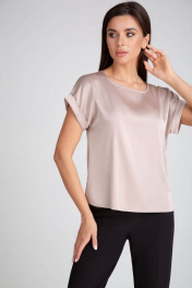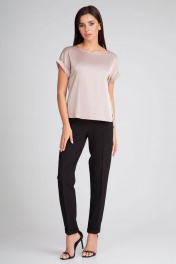 Блузка из искусственного шелка атласной фактуры. Спущенная линия плеча с цельнокроеными рукавами с отворотами. Овальный вырез горловины. Спинка слегка длиннее переда, боковые швы заканчиваются невысокими разрезами.