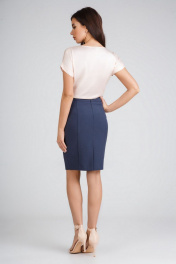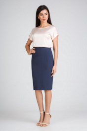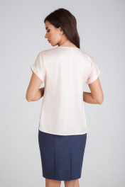 Блузка из искусственного шелка атласной фактуры. Спущенная линия плеча с цельнокроеными рукавами с отворотами. Овальный вырез горловины. Спинка слегка длиннее переда, боковые швы заканчиваются невысокими разрезами.
