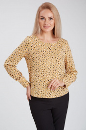 Блузка свободного силуэта. Выполнена из легкой блузочной ткани с мелким принтом. Овальный вырез горловины. Притачные рукава, с разрезом по низу и манжетой, с застежкой на пуговицы. В шов манжеты заложены небольшие складки. Передняя полочка и спинка с плавным закруглением по низу, спинка слегка удлинена.