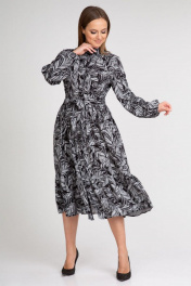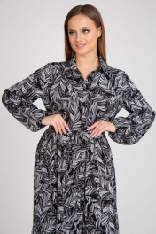 Свободное платье А-образного силуэта. Выполнено из струящейся ткани на основе хлопка. Отложной воротник-стойка, центральная застежка на пуговицы по переду. Платье отрезное по линии талии с равномерными складками по юбке и притачной оборкой по низу. Рукава пышные, с равномерной сборкой по низу, собранной на узкую манжету-резинку. Платье дополняется поясом из основной ткани.