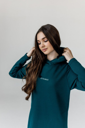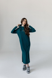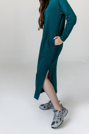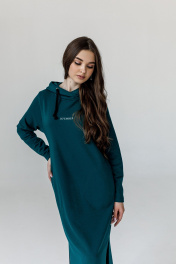 Платье прямого силуэта с двойным капюшоном. По боковым швам выполнены карманы с отсрочкой, а также - разрезы. Низ платья обработан швом в подгибку с открытым срезом. Длина изделия ниже колена.