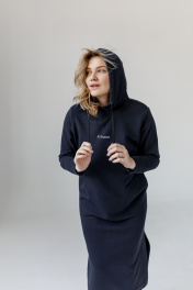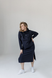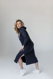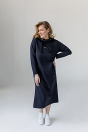 Платье прямого силуэта с двойным капюшоном. По боковым швам выполнены карманы с отсрочкой, а также - разрезы. Низ платья обработан швом в подгибку с открытым срезом. Длина изделия ниже колена.