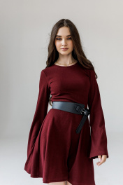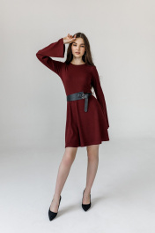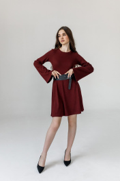Модель выполнена из трикотажа, прилегающего силуэта отрезное по линии талии с раслешённой юбкой к низу. Длина платья - выше колен. Втачные рукава дополнены расклешением к запястью. Горловина округлая, обработана бейкой. Низ платья и рукавов обработаны швом в подгибку с открытым срезом на плоскошовной машине.