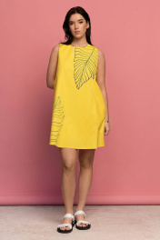 Платье женское трапециевидного силуэта без рукавов, длиной до колен. Перед и спинка с расширением по линии низа с карманами в бок.швах. Спинка со средним швом и разрезом в верхней части, пройма квадратной формы. Принт лист по по переду верх-левом плече низ-правая часть низа. На подкладке Длина спинки 87 см. ширина изделия на уровне глубины проймы 47,49,51,53 см (42,44,46,48рр) ширина по линии талии 51,53,55,57 см соответственно ширина по бедрам 56,58,61,63 см. ширина плеча 8 см.