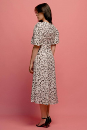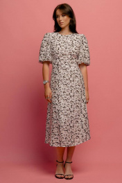 Платье женское из ткани вискоза на подкладке. Приталенного силуэта, рукав рубашечного типа со сборкой по окату и по низу. Отрезное по линии талии с застежкой молнией в левом боку. Длина платья 120 см, ширина уровне глубины проймы 45, 47, 49 см (42, 44, 46 рр.) Ширина по талии 35, 37, 39 см (42, 44, 46 рр), ширина по бедрам 50, 52, 54 см соответственно.
