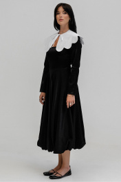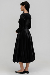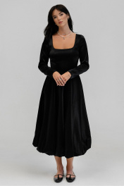 Платье женское приталенного силуэта на подкладке с потайной молнией в левом боковом шве, рукав рубашечного типа длиной до запястья. Отрезное по линии талии, длиной макси. Низ платья по типу балон. Горловина каре. Длина платья 117 см, ширина уровне глубины проймы 44,46,48,50см(42,44,46,48рр.) ширина по талии 34,36,38,40 см (42,44,46,48рр), ширина по бедрам 66,68,70,72 см соответственно.