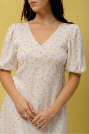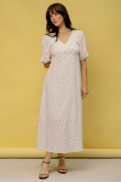 Платье молодежное женское полуприлегающего силуэта из натуральной ткани с печатным рисунком,обьемным рукавом длиной до локтя,с подкладкой .Перед с фигурным вырезом, ниже линии груди со сборкой по лифу и молнией в левом боку.По спинке V- образный вырез с завязкой по горловине.Рукав с активной сборкой по окату.По низу рукава ,складка и сборка на эластичную тесьму.Горловина V-образной формы по переду. Платье длина 121,5 см. ширина на уровне глубины проймы 45,47,49,51 см (42,44,46,48рр) Длина рукава36,5см ширина на уровне бедер 57,5,59,5,61,5,63,5см (42,44,46,48рр), на уровне талии 44,5,46,5,48,5,50,5 см.