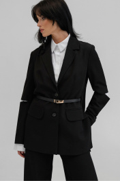 Жакет женский прямого силуэта из ткани однотон,с центральной застежкой по переду на 2 петли и пуговицы,с рукавом втачным до запястья , с воротником пиджачного типа с небольшими лацканами. Частично на подкладке.Перед с карманами клапанами,в боковых швах высокие разрезы.Рукав с горизонтальным разрезом по верхней части в области локтя. Декор ремень. Длина 74см, ширина по линии груди 50,52,54,56см. (42,44,46,48рр) ширина по талии 49,51,53,55 см ширина по линии бедер 54,56,58,60 см соответственно. Длина рукава 62см .