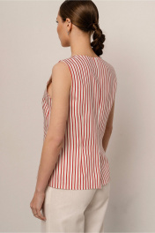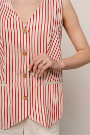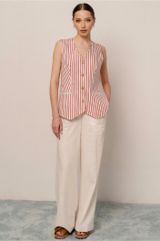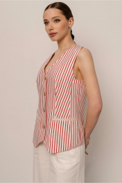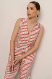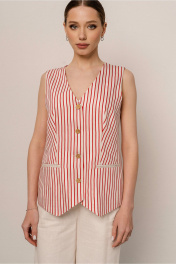 Жилет женский полуприлегающего силуэта на подкладке из ткани полоса с центральной застежкой по переду на 4 петель 4 пуговиц.Карманы по переду в рамку,горловина Vобразной формы без воротника. Спинка со средним швом со шлицей. Длина 57,5 см. ширина изделия на уровне глубины проймы 46,48,50,52см (42,44,46,48рр) ширина по линии талии 43,45,47,49см соответственно, ширина по бедрам 50,52,54,56 см.